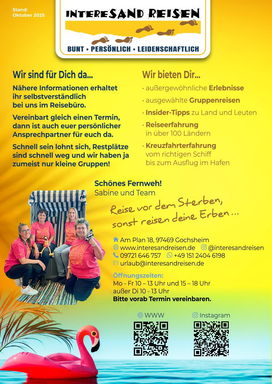 Die Gruppenreisen werden vorgestellt am 21. Oktober 2025, 18.30 Uhr im Reisebüro.